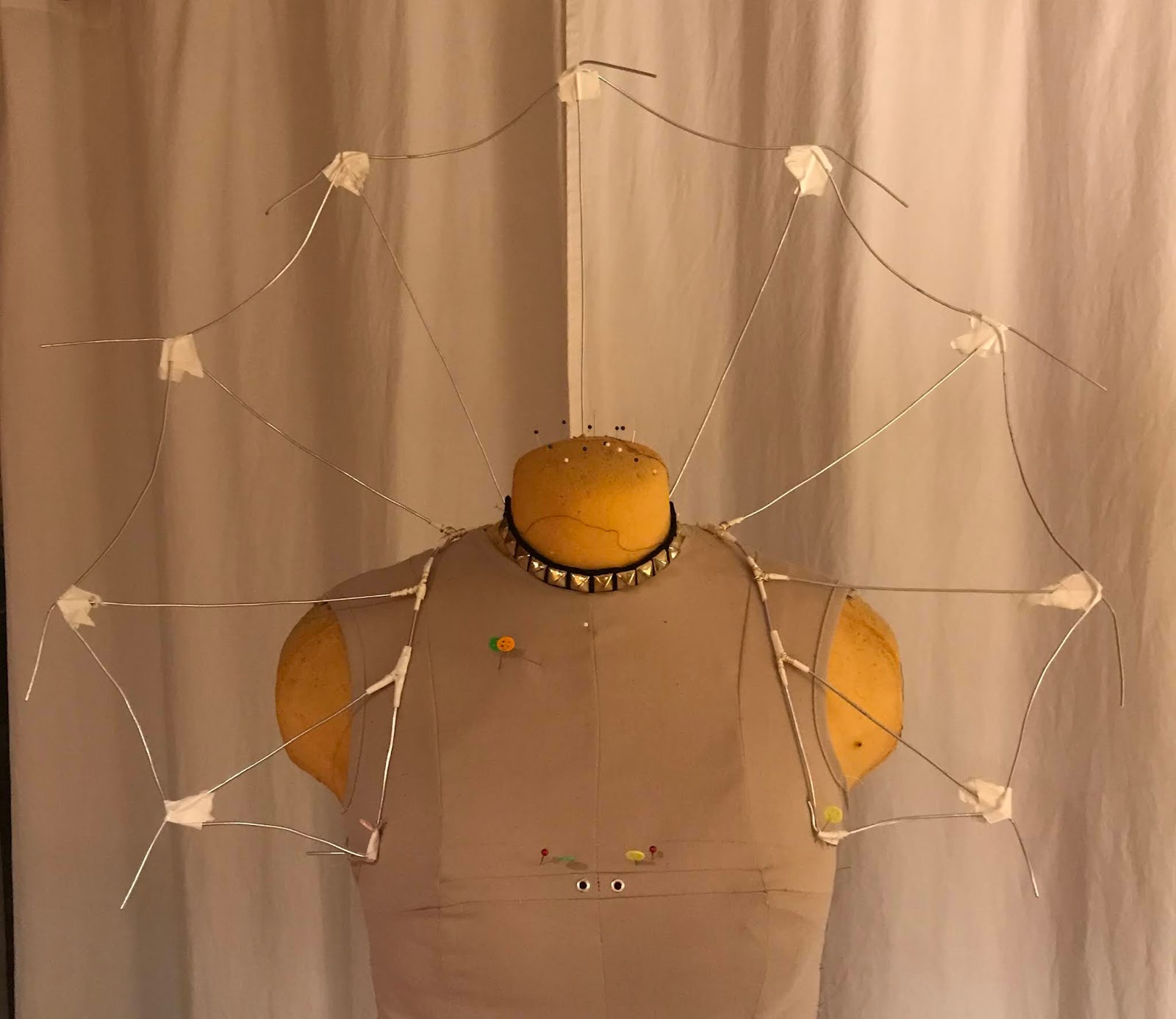 Hypothetically this was a fine approach but there were two issues. One: the tension wasn't right so I had to bend the upper wire until it stayed upright. I quite like the shape but it wasn't what I was going for. Two: There was no room for my head. So after it was all covered (I'll go over that later) I had to contour the wire so my head would have space to move. This shrunk the collar, again not what I was going for.